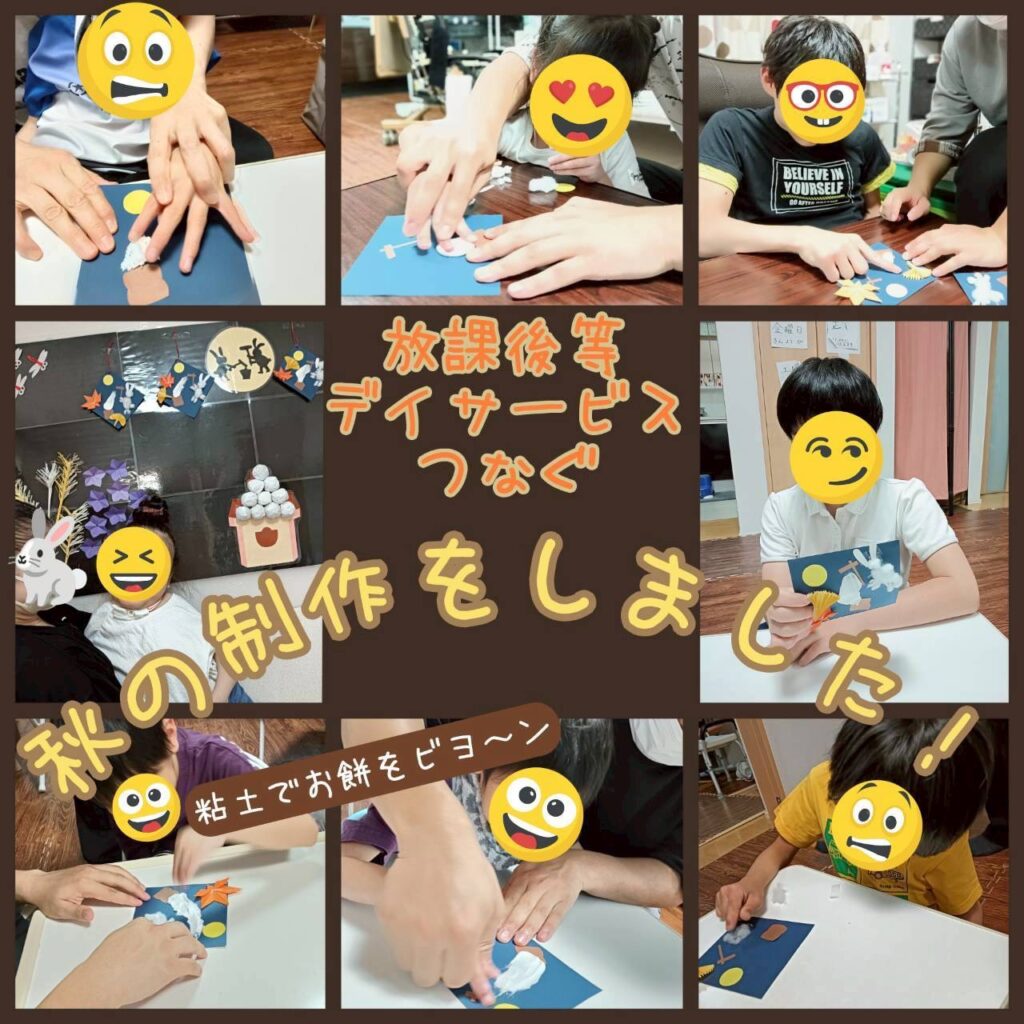 【放課後等デイサービス つなぐ】 秋の制作🎑 投稿日 2025/10/18 著者 pondup カテゴリー 未分類 お月見に合わせて、秋の制作をしました~🌙白い粘土を指で伸ばして、お餅の粘りを表現♫みんな上手に「ビヨ~ン」としていました🥰
